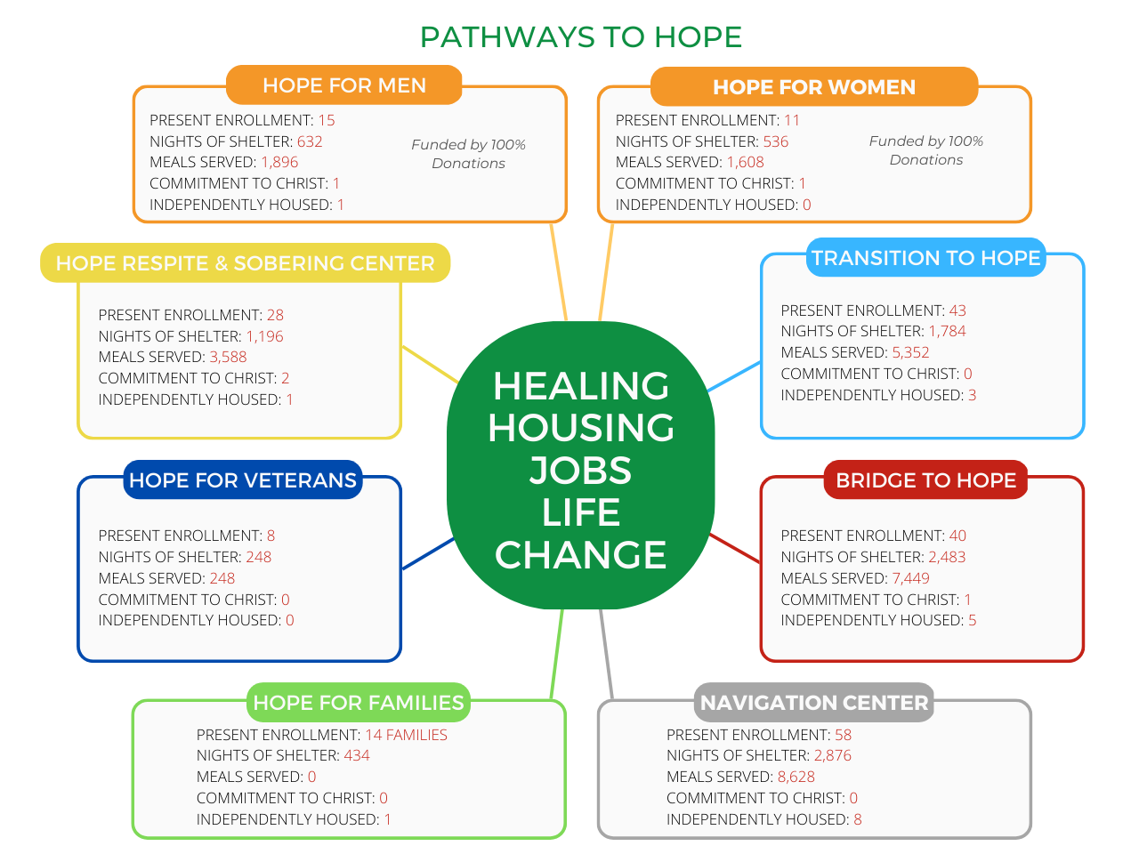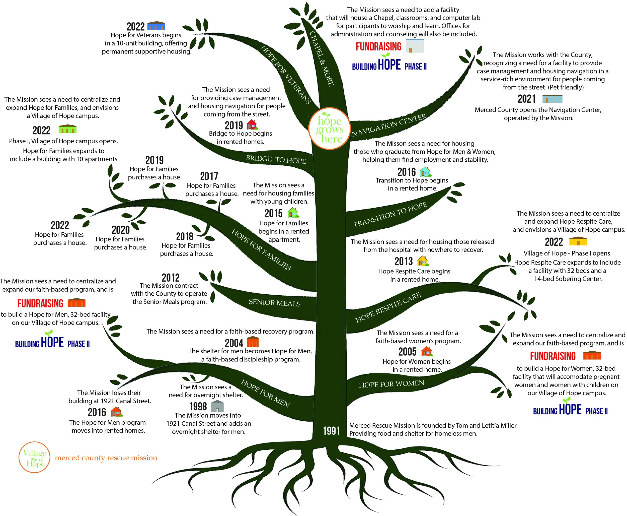 The tree provides a visual image of the growth of the Mission. Each branch depicts one of our programs and its development. It is important that the Mission works in coordination as one tree, with each branch (or program) playing a distinct role in helping people and providing hope.